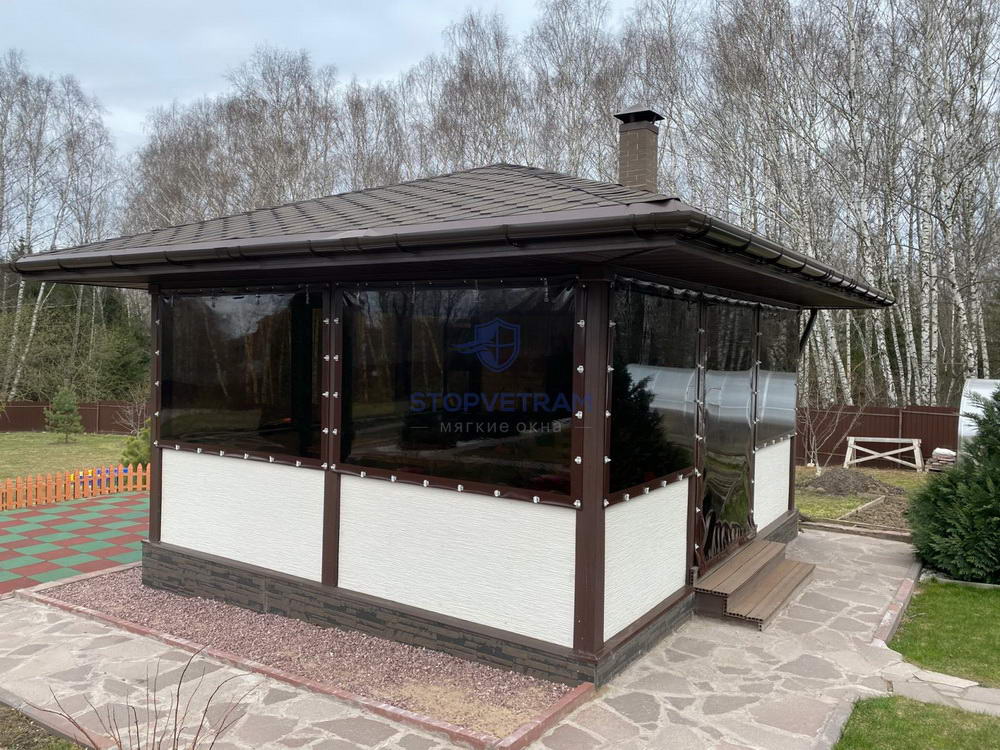 В отличие от прозрачной пленки имеют характерное затемнения, поэтому не пропускают свет в помещение. Обычно их используют, если в беседку постоянно попадает солнечный свет. Также задерживает часть ультрафиолетового спектра, за счет чего на веранде можно выращивать оранжерею без опасений, что цветы пожелтеют.